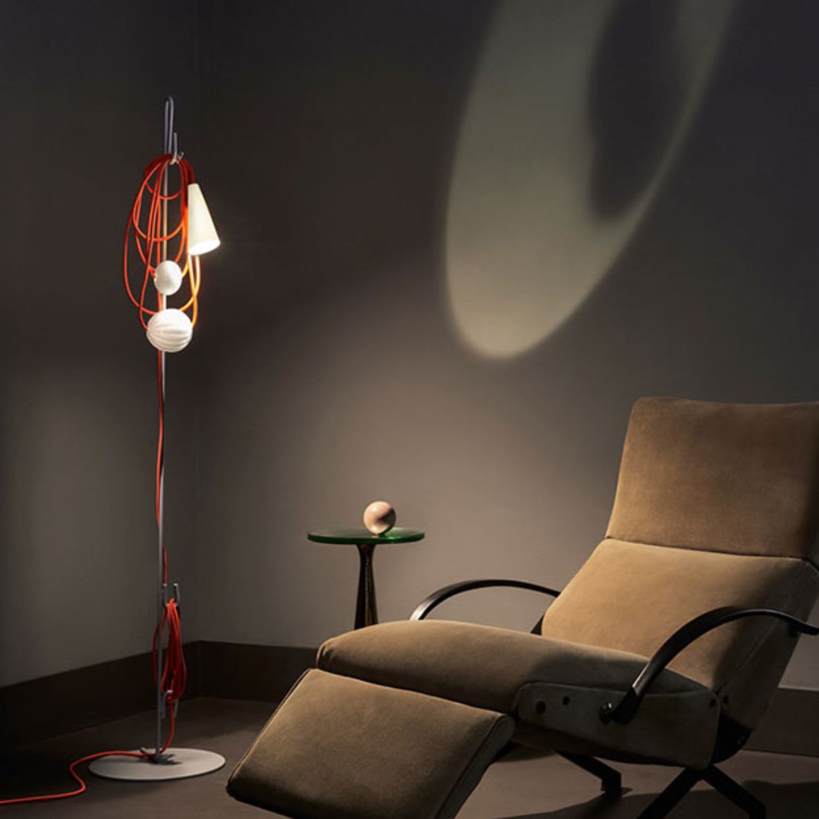Stajaća svjetiljka za direktno i difuzno osvjetljenje izrađena je od metala, porculana i puhanog stakla. Dostupna je u više kombinacija boja.